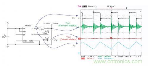 下圖描述了采用兩個(gè)不同的測(cè)試方法得到的Vout波形。電源電路是一個(gè)BUCK轉(zhuǎn)換電路(AAT1121),工作在1.5MHz的開(kāi)關(guān)頻率,輸出電壓為1.8V/250mA。示波器采用全帶寬測(cè)試??梢钥吹桨殡S著PWM開(kāi)關(guān),在綠色的trace2有一個(gè)很高的噪音以及振鈴,但是trace3上卻沒(méi)有明顯的噪聲。通過(guò)對(duì)比可以看到,測(cè)試方法的選擇對(duì)結(jié)果的準(zhǔn)確性很關(guān)鍵。
