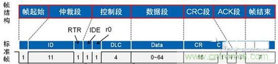 以標(biāo)準(zhǔn)數(shù)椐幀為例,從結(jié)構(gòu)上看分成7段,分別為起始段、仲裁段、控制段、數(shù)椐段、CRC校驗(yàn)段、ACK應(yīng)答段、幀結(jié)束段,如圖1所示: