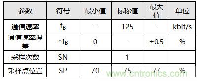 例如某著名車廠CAN通信標準里規(guī)定,通信速率為125 kbps時,應(yīng)該采用單次采樣,采樣點位置設(shè)置在70%~77%之間。其位定時參數(shù)取值可見表1與表2。