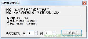 l位寬容忍度測試:采用CANScope對當前波特率下CAN卡進行位寬容忍度測試,測試其對波特率的容忍度情況,測試結(jié)果為24kbps~26kbps,容忍度情況較好;
