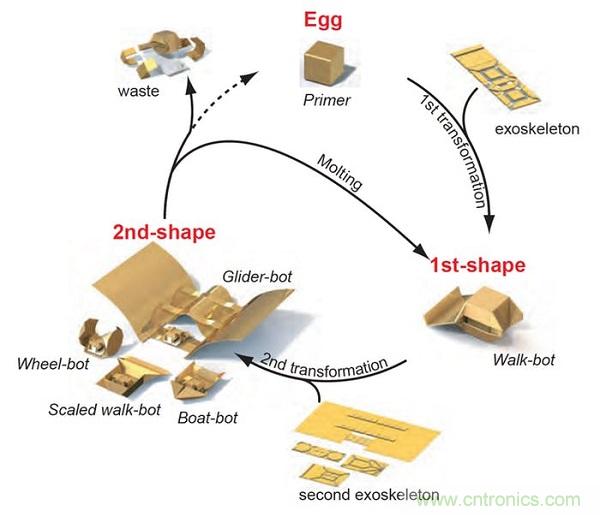 盡管目前已經(jīng)成功打造出能夠改變外形或功能的大型機器人,但要建構(gòu)能自行重新配置的小型機器人仍十分困難,部份原因在于機載電子組件的尺寸和重量限制。立方形的Primer機器人可以透過磁鐵遠程控制,而其以熱啟動的外骨骼或「皮膚」則是長方形的塑料片,可以自行折迭成不同的形狀,以便為各種不同的任務(wù)客制機器人。而當Primer完成工作后,則浸入水中溶解掉外骨骼。