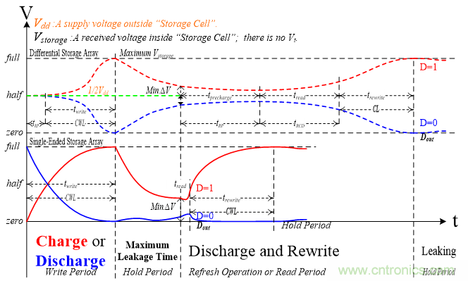 如果說3T DRAM是第一代DRAM技術(shù),使用差動放大器實現(xiàn)讀取功能的1T DRAM是第二代DRAM,那么在本文中的第三代DRAM技術(shù)是指取代差動放大器且大幅提升讀取功能的存取技術(shù)。1T DRAM的內(nèi)存基本單位是由一晶體管和一電容器所組成的儲存單元,又稱為1T DRAM單元。圖3顯示在單一儲存單元上進行存取操作的波形,上半部分是使用差動放大器的第二代技術(shù),下半部分是第三代技術(shù),此圖主要用于比較這二者完成讀取操作所需花費的最長時間。當這一電容器的儲存電壓(Vstorage)放電達到最小差異電壓(Min. ?V)時就必須立即進行更新操作(即讀取),所以此圖呈現(xiàn)有關讀取操作的最長時間就等于是更新操作的最長時間。圖中標示有tprecharge、tread、trewrite、twrite,這些技術(shù)用語依序?qū)a(chǎn)品規(guī)格的tRP、tRCD、CL與CWL。第三代技術(shù)無需tRP,除此之外,tRCD也很短暫且可由CWL替換CL,因此訪問速度接近SRAM,存取效率低于SRAM。