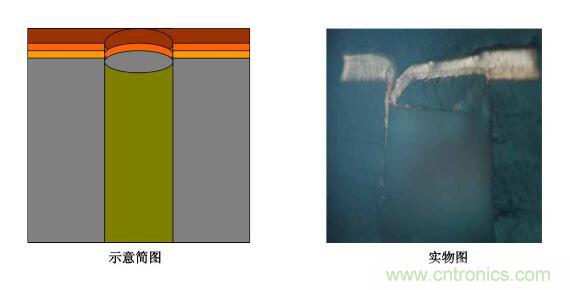 (2)孔內(nèi)板電銅薄孔無銅―――表銅板電層均勻正常,孔內(nèi)板電層從孔口至斷口處呈遞減拉尖趨勢(shì),且斷口處一般處于孔的中間部位,斷口處銅層左