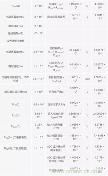 往下,在表格左側(cè),把所有誤差細分到各電阻級。電阻誤差也細分到了各個級,以便于了解相應(yīng)的權(quán)衡情況。右側(cè)所示為在信號流進流出各級時連讀計算和累計計算的誤差。