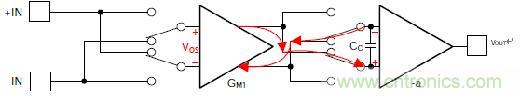 圖4顯示了后半個(gè)周期。在這里,兩組開關(guān)都配置為通過(guò)未改變的方式傳遞信號(hào)和失調(diào)誤差。實(shí)際上,輸入信號(hào)永遠(yuǎn)不會(huì)發(fā)生相位變化,始終保持不變。由于來(lái)自第一時(shí)鐘相位和第二時(shí)鐘相位的失調(diào)誤差極性相反,因此誤差被平均為零。