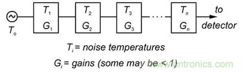 圖1:以天線或其他來源的等效噪聲溫度為起點,累加各階段的噪聲溫度可確定系統(tǒng)中各點的噪聲。(圖片來源:新澤西理工學(xué)院)