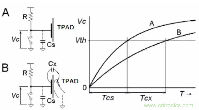 11、電容觸摸屏原理:通過充放電的曲線不同來檢測是否被按下。 實際的實驗過程中,TPAD可以用一塊覆銅區(qū)域來替代,通過電容的充放電常數(shù)來確定是否按下。