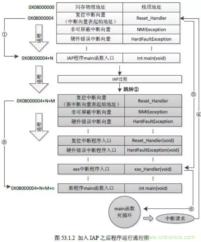 后面的過程和STM32正常運行一樣,如果出現(xiàn)中斷請求,還是跳轉(zhuǎn)到A區(qū)域中的中斷向量表中,然后再跳轉(zhuǎn)到B區(qū)域的中斷服務入口。
