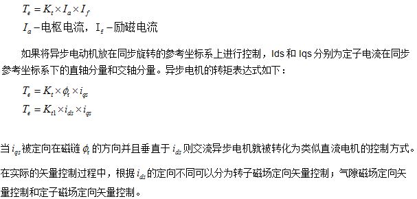 矢量控制是指根據(jù)電機運行狀況同時控制輸出量的幅值和相位。其基本的工作原理是通過電機內(nèi)以同步轉(zhuǎn)速旋轉(zhuǎn)的參考d-q參考坐標(biāo)系的數(shù)學(xué)方法,解藕出控制電機勵磁方向的電流分量Id和控制電機的轉(zhuǎn)矩方向的分量Iq,從而可以將異步電機的控制方法等效為傳統(tǒng)直流電機的控制。