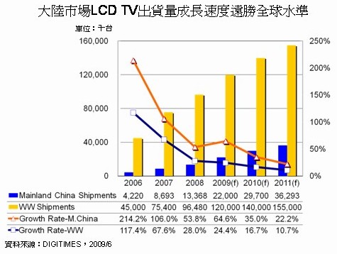 中國(guó)大陸LCD TV出貨增長(zhǎng)速度遠(yuǎn)高于全球平均水平(資料來源:DIGITIMES Research,2009年6月)