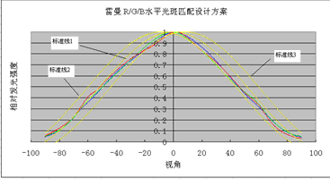 壓在三條標(biāo)準(zhǔn)線之間的是我們雷曼R/G/B的光強(qiáng)分布曲線,從圖中可以看出,我們的產(chǎn)品設(shè)計是能夠滿足高品質(zhì)顯示屏需求的。