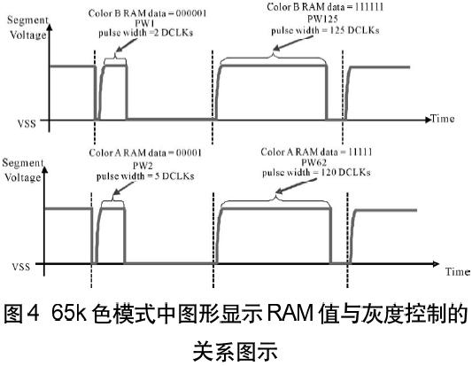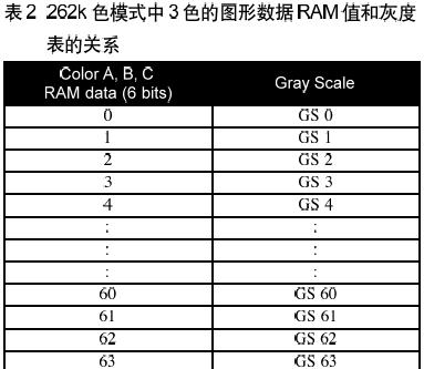 在65K色模式,情形有些不同。如表3所示,從GS0到GS63的64階灰度,有一顏色(顏色B)由6bit組成;而從GS0,GS2,.....到GS62,另外兩個(gè)顏色(顏色A和C)只有5-bit,只能呈現(xiàn)32階灰度。
