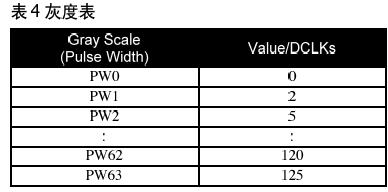 [page]這一單一的灰度表適用于三子色,脈寬的數(shù)值由軟件指令輸入。在262k模式,每一顏色包含6-bit,因在262k模式,每一顏色包含6-bit,因此每一顏色都有64階灰度(如表2所示)。