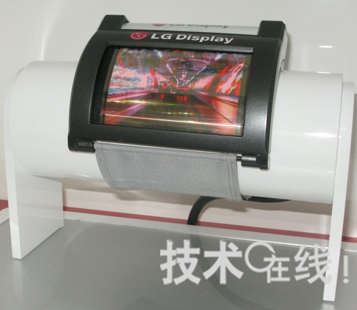 韓國(guó)LG顯示器在顯示器相關(guān)展會(huì)“FPD International 2009”(10月28~30日,太平洋橫濱會(huì)展中心)上,展出了可彎曲戴在手腕上的柔性有機(jī)EL顯示器。此為該公司在學(xué)會(huì)“SID 2009”上,于美國(guó)環(huán)宇顯示技術(shù)(UDC)展位公開過(guò)的柔性有機(jī)EL顯示器更新版。