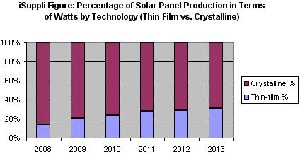 據(jù)iSuppli公司調(diào)查顯示,薄膜太陽能電池正在迅速攫取晶體技術(shù)已有的市場份額,到2013年,其光伏部分的瓦特數(shù)會增加一倍多。