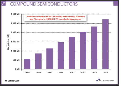 Yole公司對于HBLED的定義較其他市場研究機構(gòu)為窄,僅限于每瓦功率能夠輸出30流明以上,如應(yīng)用在汽車 和電視 背光的元件,但是大部分的LCD背光應(yīng)用都在這個分類以外。每一封裝單位能輸出100流明以上的超高亮度LED,包括汽車大燈和一般照明使用,目前擁有兩億八千萬美元的利基市場;隨著成本逐漸改善,成長力道可以預(yù)期。