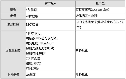 上述第1與第4項(xiàng)之流程系使用現(xiàn)有的成膜技術(shù)與材料;第2與第3項(xiàng)則為松下公司開發(fā)的多孔化PPS技術(shù)。有關(guān)第2項(xiàng)復(fù)晶硅膜制程必需將作業(yè)溫度與壓力等參數(shù)作最佳化組合,如此便可使蘇打石玻璃在450°C~550°C的低溫環(huán)境下完成長膜作業(yè)。第3項(xiàng)的電解液、液溫、電流密度等參數(shù)經(jīng)過作最佳化后,在一定條件下進(jìn)行陽極氧化,之后必需再度更改制程參數(shù)(processparameter)才可再進(jìn)行陽極氧化作業(yè)。
