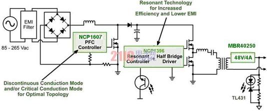 圖2:基于NCP1607和NCP1397的街道照明高能效LED電源方案。