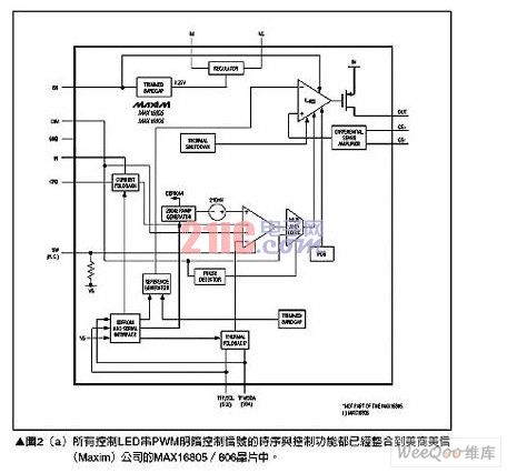 MAX16805∕806的內(nèi)部參考電路應(yīng)用在反饋回路中來監(jiān)測(cè)LED電流,同時(shí)可以通過串行接口加以調(diào)整,這將能夠讓所有的LED串共享一個(gè)固定的感測(cè)電阻,有效簡(jiǎn)化生產(chǎn)并降低成本。