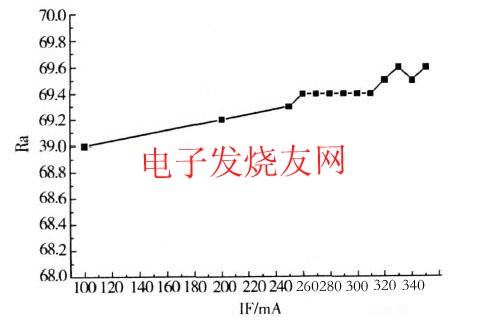 由于藍光LED與$熒光粉組成的白光系統(tǒng),其光譜中缺少紅光成分,顯色指數(shù)還不理想,這也是目前業(yè)界研究的重點課題。顯色指數(shù)與光譜成分有關,電流增加但并不影響出光的光譜的分布,所以器件的顯色指數(shù)幾乎沒有變化。