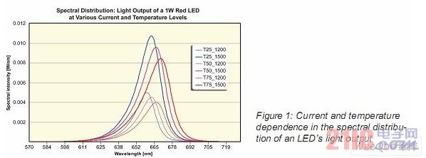 LED的光輸出特性主要取決于其工作條件。前向電流增加會使LED產(chǎn)生更多的光。但當(dāng)前向電流保持不變,光輸出會隨著LED的溫度升高而下降。圖1描述了溫度,電流和光輸出的關(guān)系。并且描述了一個LED相關(guān)的顏色光譜在峰值波長處的偏移。用于普通照明的單色LED,藍色光譜的峰值會發(fā)生偏移,因此改變了LED所謂的色溫。這會對LED照明空間內(nèi)的感官產(chǎn)生影響。