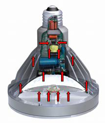 溫度傳感器NTC做LED燈具的過溫保護(hù)被比較早的廣泛應(yīng)用。LED燈具如采用大功率LED光源,就必須采用多翼的鋁散熱器,由于室內(nèi)照明用的LED燈具本身空間很小,散熱問題到目前還是最大的技術(shù)瓶頸之一。LED燈具散熱不爽的話,會導(dǎo)致LED光源因過熱而早期光衰。LED燈具開啟后熱量還會因熱空氣自動上升而向燈頭富集,影響電源的壽命(圖9)。因此在設(shè)計LED燈具時可以在鋁散熱器靠近LED光源方緊貼一個NTC,以便實時采集燈具的溫度,當(dāng)燈杯鋁散熱器溫度升高時可利用此電路自動降低恒流源輸出電流,使燈具降溫;當(dāng)燈杯鋁散熱器溫度升高到限用設(shè)定值時自動關(guān)斷LED電源,實現(xiàn)燈具過溫保護(hù),當(dāng)溫度降低后,自動再將燈開啟(圖10)。