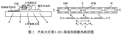 本文研究的汽車前大燈用LED是目前OSRAM公司最大功率的一種LEUMD1W4;管芯散熱設(shè)計選用了一種更利于散熱的LE3S封裝。這種封裝的特點是,以面積較大的銅合金散熱墊為基座,管芯固定在基座中央。同時將LED基座與鋁基板接觸區(qū)域的絕緣介質(zhì)剝離,使銅合金基座與鋁基板直接接觸?;系臒嶂苯觽鲗?dǎo)至LED的外部。這種內(nèi)部結(jié)構(gòu)去處了管芯和基座之間的介質(zhì)減少了熱阻,更直接地將管芯的結(jié)溫導(dǎo)出(見圖2a)。