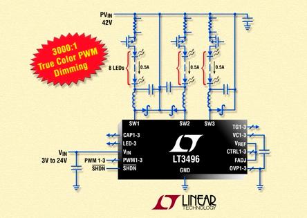 • True Color PWM調(diào)光實現(xiàn)高達3000:1的調(diào)光比