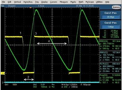 圖3 詳細(xì)地示意了LED驅(qū)動(dòng)器在一個(gè)完整交流電周期內(nèi)Q3的漏源電壓和電流情況。