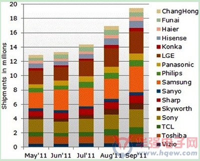 至于代工廠商情況,5月份臺(tái)灣 前七大 OEM 電視廠商總產(chǎn)量月成長(zhǎng)13%,與預(yù)期相符。成本競(jìng)爭(zhēng)和一體化業(yè)務(wù)模式使景智光電、仁寶、富士康、新奇美、TPV等OEM廠商從品牌商手中拿到了更多的訂單。2011年第三季,OEM廠商總計(jì)畫產(chǎn)量為1,400萬臺(tái),季成長(zhǎng)預(yù)估提高24%。