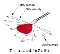 LED的發(fā)光強(qiáng)度隨觀察角度的變化而變化,從不同角度觀察LED發(fā)光管,它的發(fā)光強(qiáng)度有很大差別。發(fā)光強(qiáng)度的大小由LED發(fā)光管自身的發(fā)光強(qiáng)度角分布曲線決定,其分布曲線如圖1所示。LED光軸方向相對(duì)發(fā)光強(qiáng)度(即發(fā)光強(qiáng)度與最大發(fā)光強(qiáng)度的之比)為1,即發(fā)光強(qiáng)度最大。離開光軸方向的角度越大,相對(duì)發(fā)光強(qiáng)度越小。由圖1可以估算出該LED的半值角,視角值為。