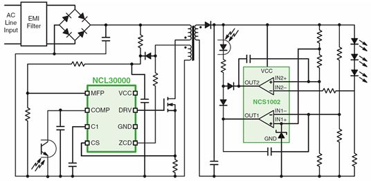 要針對低功率LED照明應用提供高于0.9的功率因數(shù)及低總諧波失真,以適合商業(yè)應用要求,就有必要使用新的拓撲結構。在這種情況下,可以使用基于NCL30000臨界導電模式(CrM)反激控制器的單段式CrM反激拓撲結構。單段式拓撲結構省下專用的PFC升壓段,幫助減少元器件數(shù)量,降低系統(tǒng)總成本,并提供高功率因數(shù)。圖8顯示的是基于NCL30000的單段式高功率因數(shù)反激拓撲結構的簡化功能框圖。