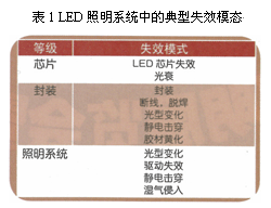 LED模組和燈具的典型失效模式包含了不同層次的失效模式,涉及到LED封裝結構以及工藝過程(如表1)。LED在實際使用中,由于復雜的環(huán)境以及封裝工藝局限性從而使封裝材料退化、熒光粉退化、金屬電遷移、局部溫度過高產(chǎn)生的熱應力所引起的芯片和硅膠的分層或金線斷裂等等,從而影響LED發(fā)光甚至導致整個LED的失效。而且LED產(chǎn)生的高溫會導致芯片的發(fā)光效率降低,光衰加快、色移等嚴重后果。