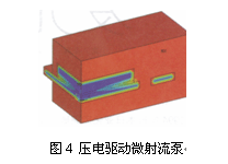 另一種主動冷卻系統(tǒng)是利用壓電驅動而產(chǎn)生脈動空氣,如圖4所示。該結構簡單,由一個PZT膜片和流動通道構成。該流動通道中設計者重點論述了出口和進口通道的設計。這種結構允許每一個振動周期中的流體在管道中的阻力和動力差別。