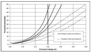 即使是同一型號的LED其伏安特性在各個個別的器件之間也是不同的,更何況在不同生產廠家之間就更是不同了(圖8)。