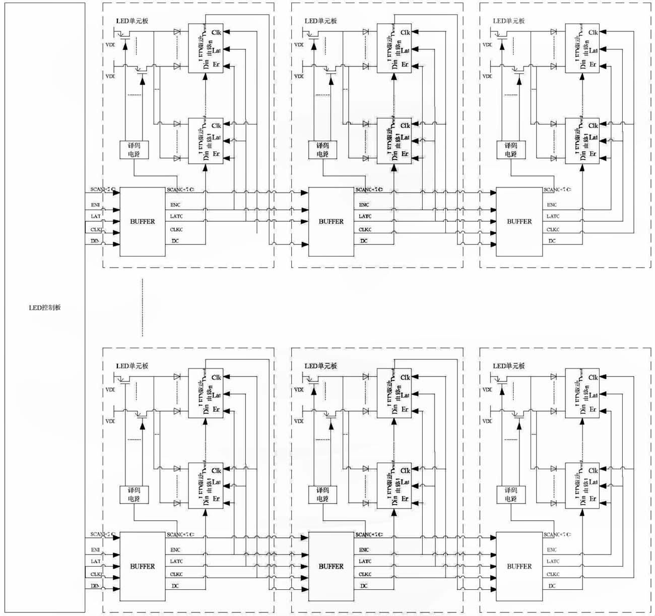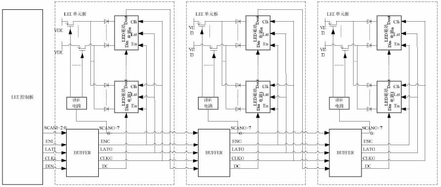 LED 控制板與LED 單元板構(gòu)成的LED 顯示系統(tǒng)的主體,如圖1 所示。其中,LED 單元板包括了增強信號驅(qū)動能力的BUFFER 電路、產(chǎn)生動態(tài)顯示掃描時序的譯碼電路、若干個開關(guān)管和若干個LED 驅(qū)動電路。其通信過程為:LED 控制板發(fā)出的通信信號依次經(jīng)過各串接的LED 單元板的BUFFER 電路進行驅(qū)動增強;各LED 單元板中經(jīng)BUFFER 電路增強后的掃描信號(SCANO)提供給本LED 單元板的譯碼電路,譯碼電路譯碼產(chǎn)生動態(tài)顯示掃描時序控制開關(guān)管;各LED 單元板中經(jīng)BUFFER 電路增強后的使能信號(ENO)、鎖存信號(LATO)、時鐘信號(CLKO)分別提供給本LED 單元板中所有LED 驅(qū)動電路。