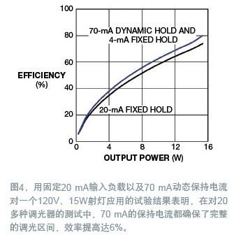 LM3450采用了這種采樣相位解碼器方法,因此只有在采樣周期內,動態(tài)保持才有效。為驗證這個方案,同時用一個固定的20 mA保持電流和一個大得多的70 mA動態(tài)保護電路,做了一個120V、15W的射燈應用(圖4)。在對20多種調光器的測試中,70 mA動態(tài)保持法都確保了完整的調光區(qū)間,效率提高達6%。