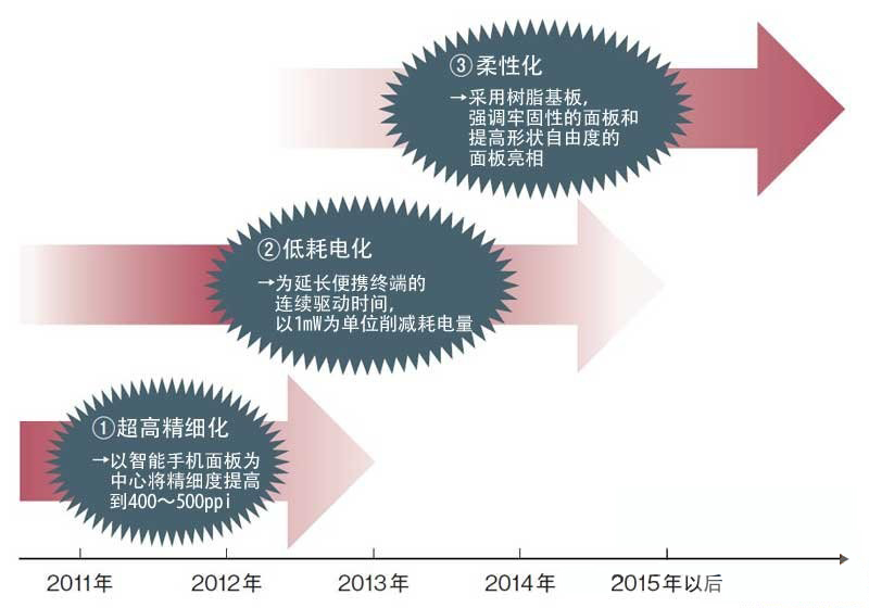 ①超高精度化的目標是,能在智能手機面板上顯示1920×1080像素的全高清影像。為此,需要將分辨率由目前的330ppi提高至400~500ppi。②低耗電量化方面,為延長便攜終端的連續(xù)驅動時間,需要以1mW為單位不斷削減耗電量。③柔性化方面,為實現(xiàn)具有高堅固性和高形狀自由度的面板,需要采用樹脂基板。