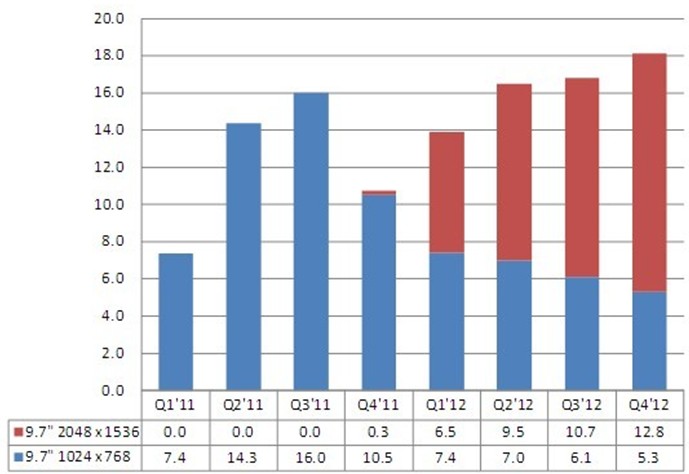 NPD DisplaySearch 指出,展望2012年,9.7寸iPad 面板出貨預(yù)計將可達6千5百萬片以上,主要驅(qū)動力來自于新的iPad機種的推出、既有iPad面板的成本再降低、面板分辨率的再提升以及新面板技術(shù)(例如薄化玻璃、透明金屬氧化物晶體管TFT LCD等等)的采用。