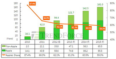 2010~2015平板市場(chǎng)總量與iPad占比預(yù)估