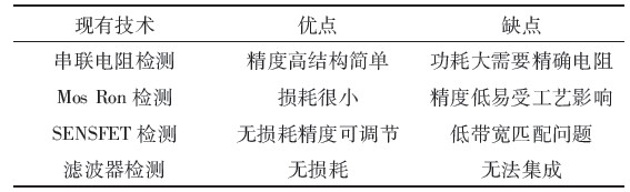 表1中列出了現(xiàn)有的幾種電流檢測(cè)技術(shù)并列舉了其優(yōu)缺點(diǎn)。