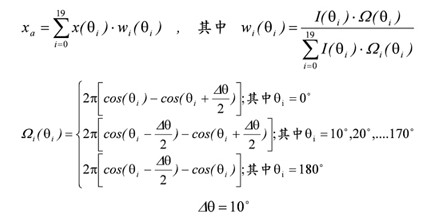 在量測θ=0°和90°(或更多的θ角)的色度坐標(biāo)和光強度時,首先在每個θ角上取平均,表示為x(θi)、y(θi)以及I(θi),這里的θi=0°、10°、20°等直到180°。然后平均色度坐標(biāo)xa由下列加權(quán)平均式子算出,量測示意圖如圖13。
