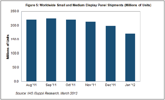 臺灣廠商的產(chǎn)能利用率從上一季度的62%降至58%,導致1月中小顯示器面板出貨量降至1.313億個,比2011年12月減少2900萬個。臺灣六家供應商按出貨量降序排列:中華映管,奇美電子,瀚宇彩晶,勝華科技,友達光電和凌巨科技。