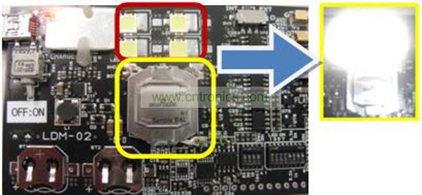 圖2中EDLC作為輔助電源,顯示了8A的電流流入LED時的數(shù)據(jù)。得出的結果是超過了1,000lux的亮度。