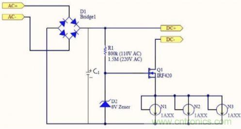 最簡單的方法就是和恒流二極管串聯(lián)一個齊納二極管來提高耐壓(圖17)。