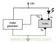 采用PWM信號調(diào)光以后可以避免由于改變電流而引起的光譜偏移。但是不能采用只有兩條管腳的恒流二極管,而必須采用帶有控制開斷管腳的至少3條管腳的恒流二極管。