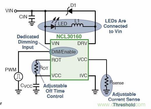 大功率LED可采用安森美半導(dǎo)體的恒流降壓LED驅(qū)動器NCL30160,實現(xiàn)高達(dá)98%的能效。它采用30 mΩ集成MOSFET,100%占空比可提供高能效;輸入電壓范圍為6.3 V至40 V,開關(guān)頻率可達(dá)1.4 MHz;還具有專用PWM調(diào)光引腳/低功率關(guān)閉、無須控制環(huán)路補(bǔ)償和1.5 A平均電流能力。