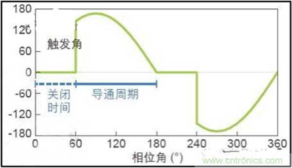 因此前沿切相調(diào)光的特點(diǎn)綜合起來(lái)就是:每半周期內(nèi),過(guò)零關(guān)斷,延時(shí)導(dǎo)通至半周期末。