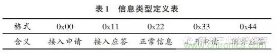 以容量為10人的紫外光語(yǔ)音通信系統(tǒng)為例說(shuō)明數(shù)據(jù)幀結(jié)構(gòu)的設(shè)計(jì)。考慮到通常情況下人講話的語(yǔ)速為每分鐘160~180個(gè)漢字,在保留一定余量的情況下,假設(shè)每分鐘240個(gè)漢字,如果壓縮后的語(yǔ)音信號(hào)速率為4.8Kb/s,可以算出平均每個(gè)漢字時(shí)間內(nèi)的比特?cái)?shù)為1200b。據(jù)此設(shè)計(jì)的數(shù)據(jù)幀結(jié)構(gòu)如圖3所示,其中數(shù)據(jù)的信息速率為60Kb/s,信息體長(zhǎng)度為1200b,時(shí)隙頭長(zhǎng)度為96b。時(shí)隙頭包括前導(dǎo)序列、信息類型、發(fā)送方代號(hào)和接收方代號(hào),長(zhǎng)度分別為72b,8b,8b和8b。每一個(gè)用戶只處理接收代號(hào)和自己的代號(hào)一致的時(shí)隙。收發(fā)雙方作為一個(gè)組合占用相鄰的兩個(gè)時(shí)隙。前導(dǎo)序列為0,1交替的序列,信息類型的定義如表1所示。