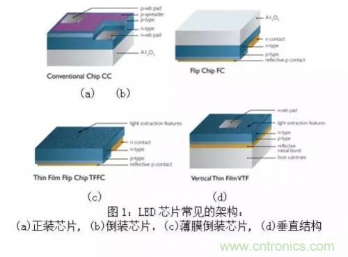基于氮化鎵的藍/白光LED的芯片結構強烈依賴于所用的襯底材料。目前大部分廠商采用藍寶石作為襯底材料,芯片結構主要分為4類,如圖1所示: